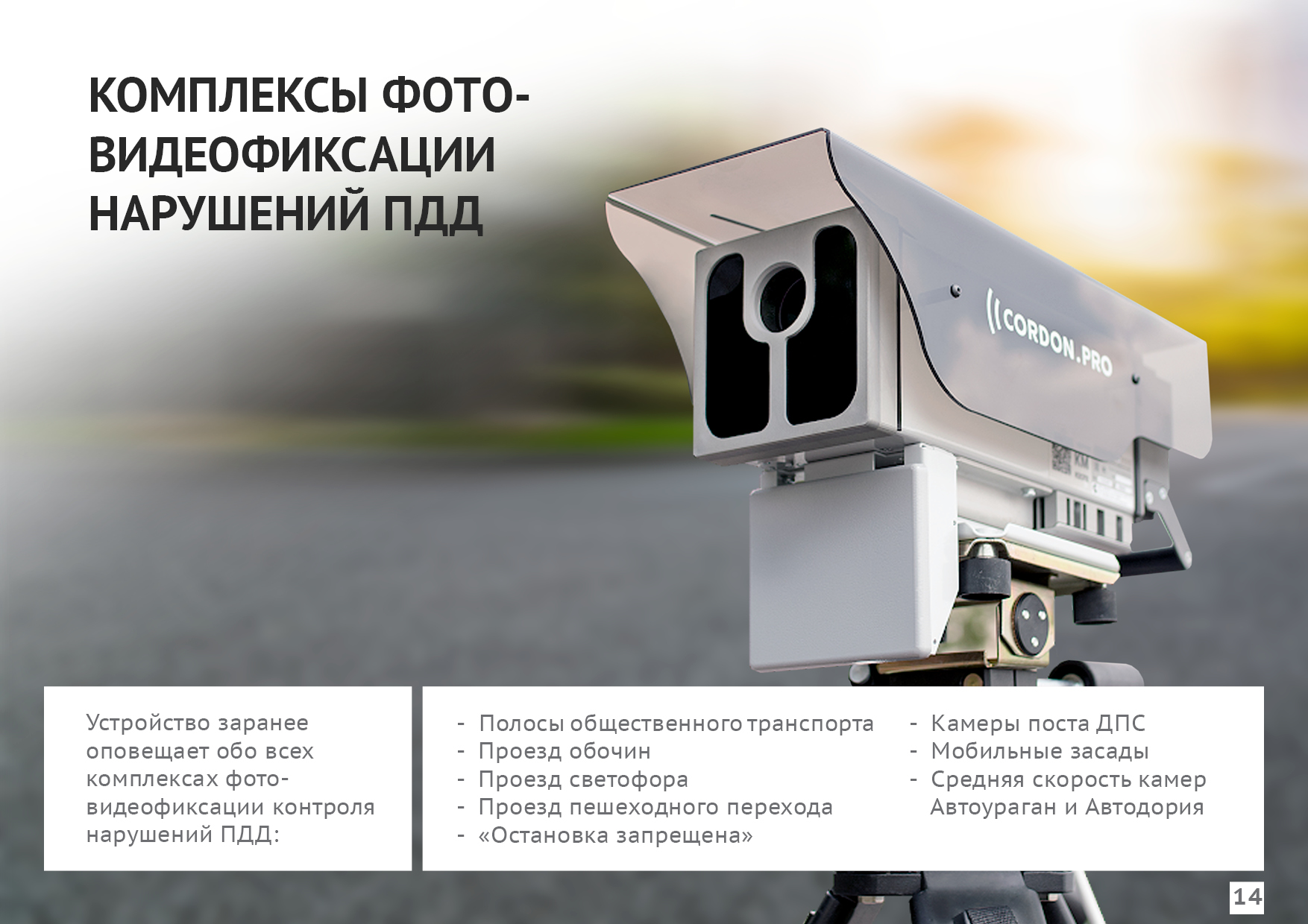 Устройство заранее оповещает обо всех комплексах фотовидеофиксации контроля нарушений ПДД: полосы общественного транспорта, проезд обочин, проезд светофора, проезд пешеходного перехода, «остановка запрещена», камеры поста ДПС, мобильные засады, средняя скорость камер Автоураган и Автодория.