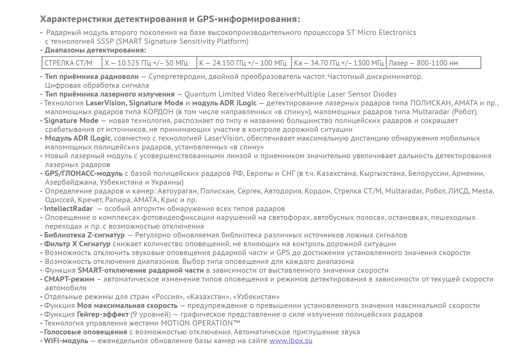 В iBOX ONE LaserVision WiFi Signature интегрирован широкий выбор функций, которые позволяют индивидуально настроить устройство: отрегулировать голосовые и звуковые оповещения отдельно по радарной части, с отключением отдельных частот (К, Ка, Х, Стрелка, Лазер и др.) и по части GPS (посты ДПС, камеры системы Автодория, стационарные радары Стрелка, муляжи радарных комплексов и др.), настроить различные варианты детектирования и дальности оповещения.
