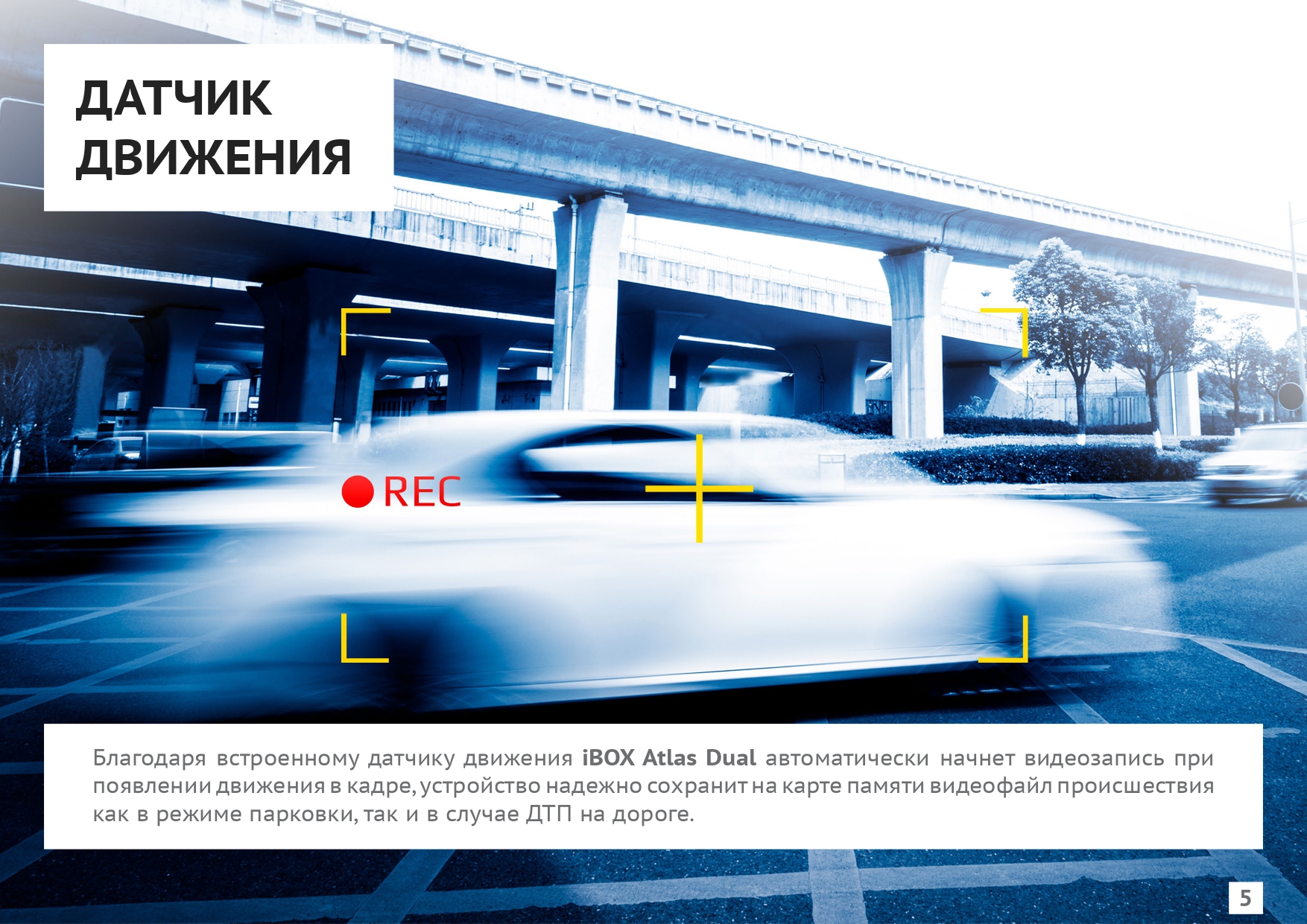 Большой, сенсорный IPS-экран диагональю 5 дюймов со сверхшироким углом обзора и улучшенной цветопередачей, дает возможность просматривать записанные видеоролики на самом видеорегистраторе и комфортно производить настройки устройства.