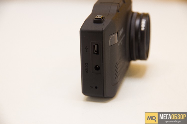 Спереди не сильно выпирает объектив камеры, на который можно установить CPL-фильтр (не включен в комплект поставки), обеспечивающий минимальное попадание в кадр солнечных бликов. Левее размещена линза радар-детектора и название модели. Разработчики использовали матрицу Sony Exmor IMX323, которая показывает отличные результаты в работе и позволяет записывать видео в высоком разрешении. Однако об этом чуть позже.