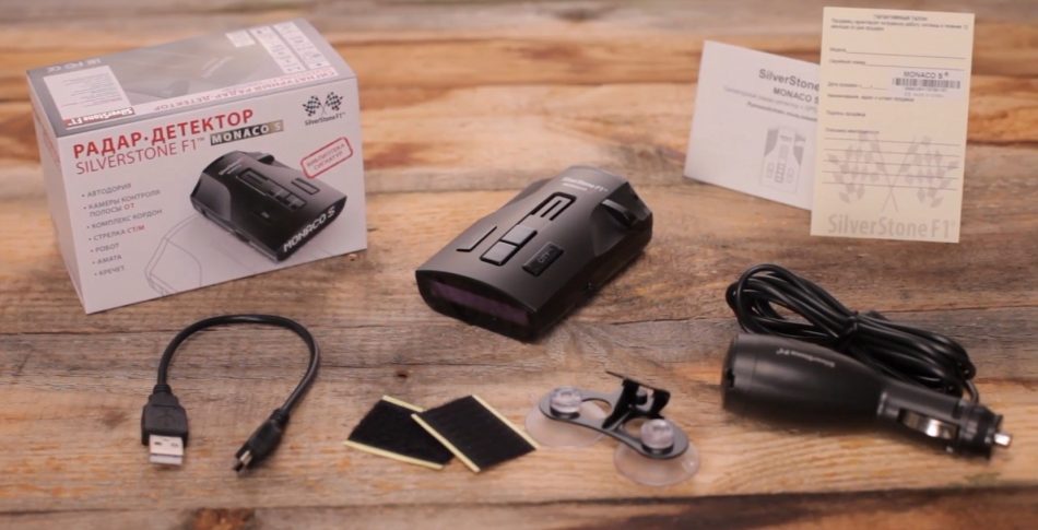 Устройство попадает в руки к пользователю в фирменной миниатюрной коробке. Кроме самого девайса, в наборе имеется все, что нужно для закрепления радар-детектора в автомобиле, провод питания и USB-кабель.