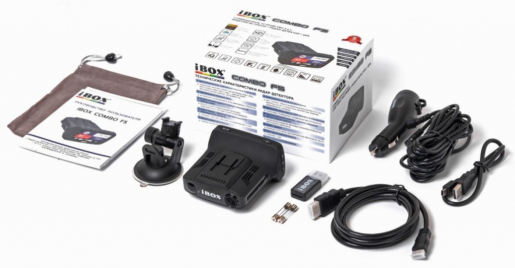 Распаковываем коробку и выкладываем ее содержимое на стол. В комплекте видим сам комбайн iBOX Combo F5, автомобильное ЗУ в гнездо прикуривателя с двумя запасными предохранителями, кронштейн с присоской для крепления на стекло, кабель miniHDMI-HDMI для просмотра видеозаписей на ТВ, шнур miniUSB-USB для соединения с ПК и обновления GPS-базы, а также картридер microSD-USB для копирования видео на ПК и тканевый мешочек для хранения и переноски.